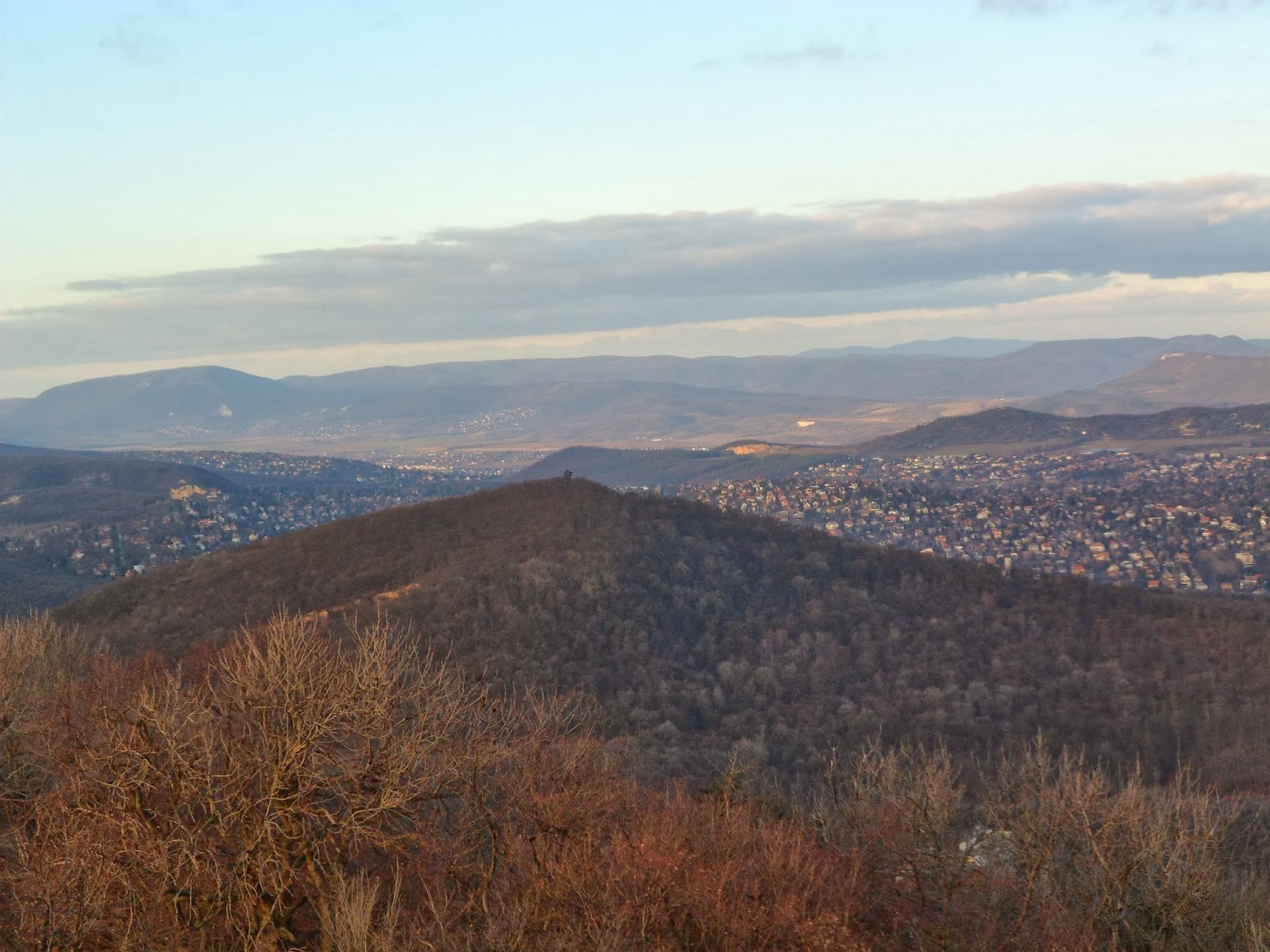 Becsületemre legyen mondva minden szintet megmászok, még a legmagasabbról is körbe ámulom a tájat. Körbe a látvány, hát az valami gyönyörűség, egyenesen leírhatatlan, ebben a januári tavaszban meg különösen, amikor a fák zöld koronája nem korlátozza a kilátást, igaz, nem is színesíti. Ebben a tiszta, harapni való levegőben míg sasszem ellát, lehetett élvezni az elibénk terülő látványt a várossal és a környező településekkel.
